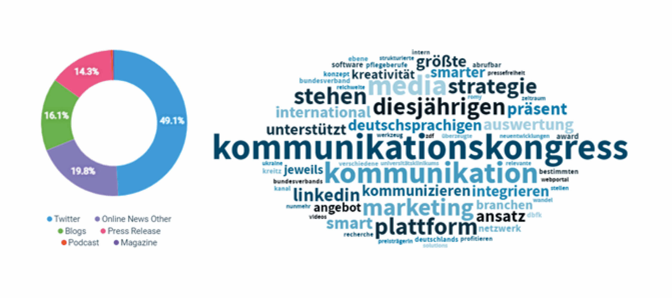 Im Netz wurden im Monat September knapp 300 Beiträge zum Kommunikationskongress in deutschsprachigen digitalen Medien veröffentlicht, die unser Monitoring-Tool identifiziert hat. Diese generierten ein stolzes Engagement von 190. Die Reichweite in diesem Zeitraum lag bei 5,4 Mio. potenziellen Kontakten. Einen Peak erzeugte der erste Kongresstag mit 70 Postings.