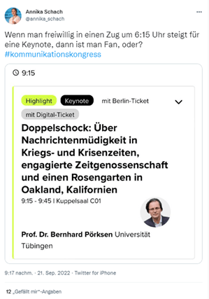 Die Professorin für Public Relations, Linguistin und Geschäftsführerin Annika Schach (ca. 4,7 Tsd. Follower*innen) vermittelte in einem Tweet ihre Begeisterung für Prof. Dr. Bernhard Pörksen und Vorfreude auf den Kongress.