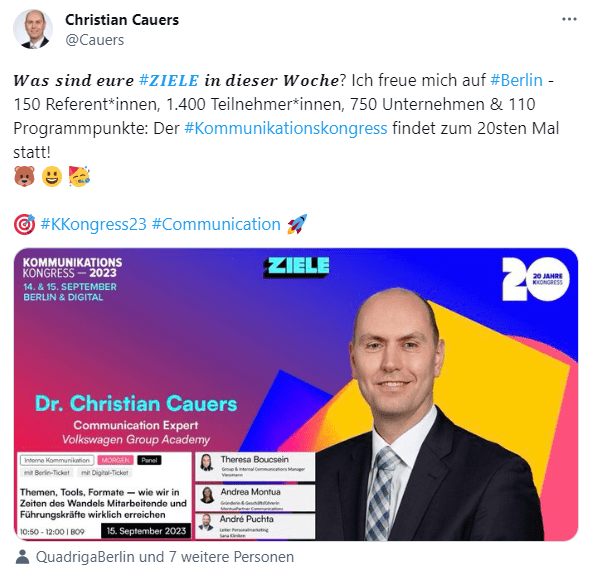 Auch Christian Cauers (ca. 300 Follower*innen), Kommunikationsexperte der VW Group, teilte seine Vorfreude ebenfalls auf X und stellte neben spannenden Fakten rund um den Kongress, das Jubiläum in den Mittelpunkt.