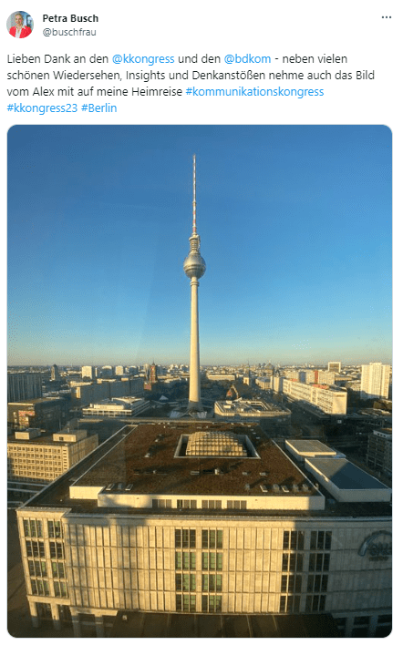 Mit einem sonnigen Dankeschön aus Berlin verabschiedete sich Petra Busch, Managing Director bei picture alliance, vom Kommunikationskongress 2023. Auf Wiedersehen im nächsten Jahr!