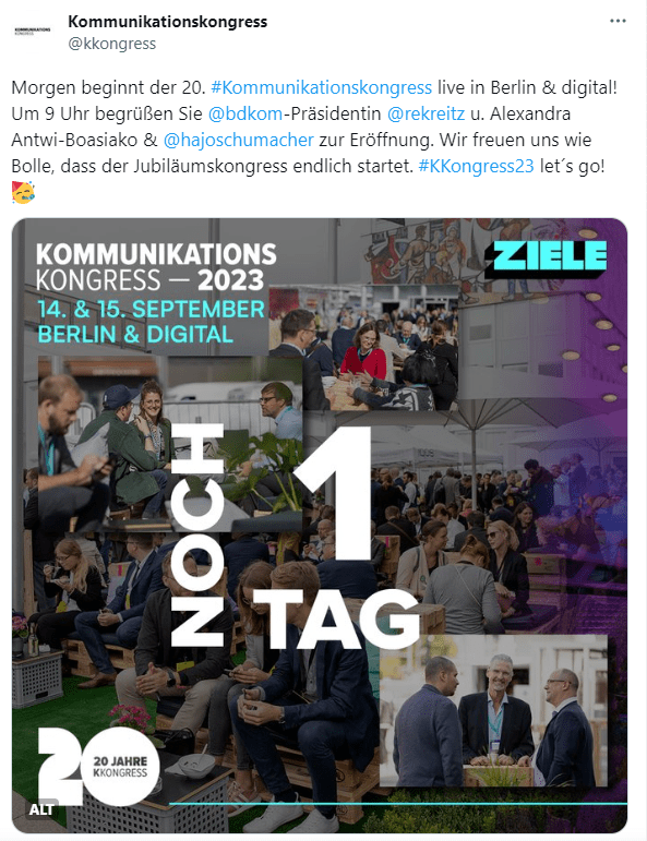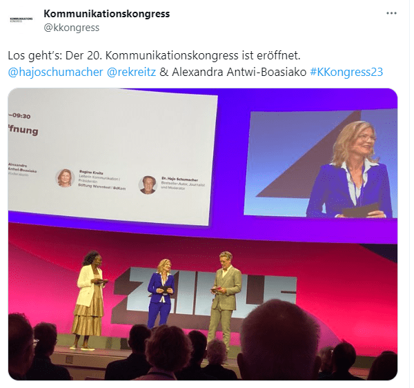 Im Vorfeld der Veranstaltung warb der Kommunikationskongress (ca. 2.200 Follower*innen) mit einem Ausblick auf die Moderation und die anschliessende Eröffnung.