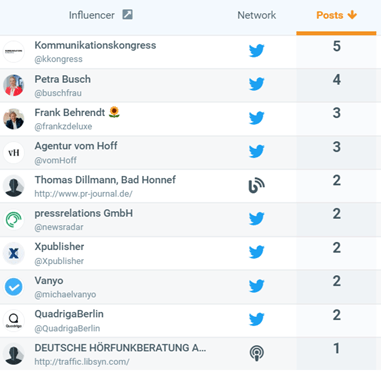 Unsere Auswertung zeigt, dass sich der Kommunikationskongress selbst unter den Top-Influencer*innen befindet, gefolgt von den Teilnehmer*innen Petra Busch sowie Frank Behrendt. Auch Agenturen und der Veranstalter Quadriga sind auf X vertreten.