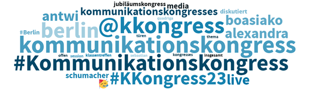 Die Präsenz auf X (ehemals Twitter) fokussiert sich auf kurze, positive Eindrücke der Teilnehmer*innen vor Ort. Neben dem Hashtag #Kommunikationskongress, erzeugt auch #KKongress23live Sichtbarkeit.