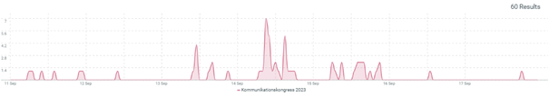 Die Auswertung mit unserem Social Media Monitoring Tool Talkwalker zeigt 60 veröffentlichte Beiträge, die von rund 40 Accounts geteilt wurden, im Beobachtungszeitraum vom 11. bis 17. September 2023. Damit wird eine Reichweite von rund 3,2 Mio. potenziellen Kontakten erzielt. Mit einem Anteil von 90 % dominieren deutschsprachige Beiträge vor englischsprachigen.