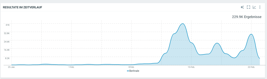 Als Analysezeitraum haben wir das Zeitfenster 25.01. – 23.02. (Stand: 10:00 Uhr) gewählt. Insbesondere weil wir davon ausgegangen sind, das vor allem im Zeitraum vor Festivalbeginn zahlreiche Beiträge erschienen sind. Genutzt wurde das Monitoring-Tool Talkwalker, als Suchphrase diente uns eine denkbar simple Searchquery (Berlinale).