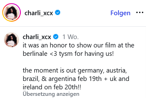 Der Post mit dem höchsten Engagement wurde von der Künstlerin Charlix xcx veröffentlicht, die auf der Berlinale mit einem Film über die Höhen und Tiefen ihres Erfolgs vertreten war (Titel: The Moment). Ihr Instagram-Post vom 15.02. (Beitrag inzwischen gelöscht) erreichte ein Gesamt-Engagement von ca. 437 Tsd. Reaktionen.