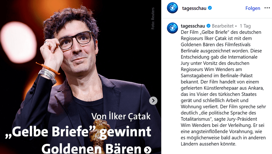 Der goldene Bär, die höchste Auszeichnung der Berlinale, ging an den Film „Gelbe Briefe“ des Regisseurs İlker Çatak. Damit wurde erstmals seit mehreren Jahrzehnten wieder ein deutscher Regisseur mit dem Hauptpreis ausgezeichnet.