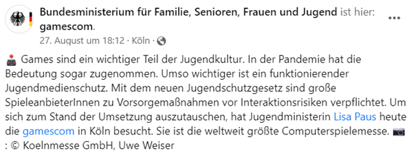 Daneben wird auch von der offiziellen Facebook-Seite vom Bundesministerium für Familie, Senioren, Frauen und Jugend auf die Messe hingewiesen. Betont wird hier, dass Games ein «wichtiger Teil der Jugendkultur» sind und daher ein «funktionierender Jugendmedienschutz» besonders wichtig ist.