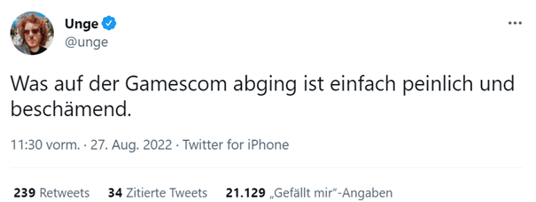 Die Reaktionen zum Vorfall waren dabei meist negativer Natur. Viele Nutzer*innen verurteilten den Vorfall. Auch Influencer*innen zeigten sich geschockt und veröffentlichten entsprechende Beiträge über die jeweiligen Social-Media-Kanäle. So schreibt der populäre YouTuber unge (2,4 Mio. Follower*innen auf Twitter) am 27.08. «Was auf der gamescom abging ist einfach peinlich und beschämend».
