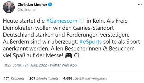 Ansonsten ist noch erwähnenswert, dasss wie in den Vorjahren auch Politker*innen und Ministerien auf ihren offiziellen Seiten Posts zur gamescom veröffentlichten. Der engagement-stärkste Post in diesem Zusammenhang ist hier der Tweet von FDP-Politiker Christian Lindner, der auf den Start der Messe hinwies und forderte dass e-Sports als Sport anerkannt wird.