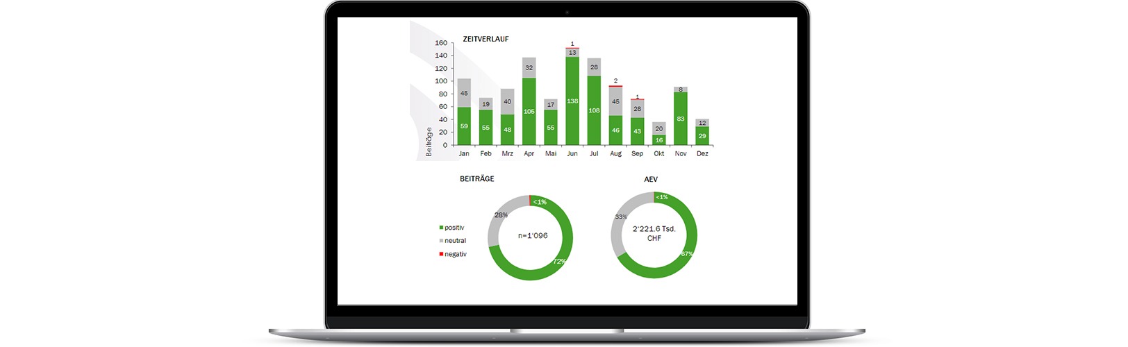 Welche Kommunikationsmassnahmen waren erfolgreich? Welche Akteure haben Ihre Inhalte aufgegriffen und weiterverbreitet? Wurden Ihre Kernbotschaften übernommen? Welche Inhalte erhielten viel Resonanz und welche weniger? Wurde das strategische Ziel der Massnahme erreicht, wie stehe ich im Vergleich zu Anderen da?