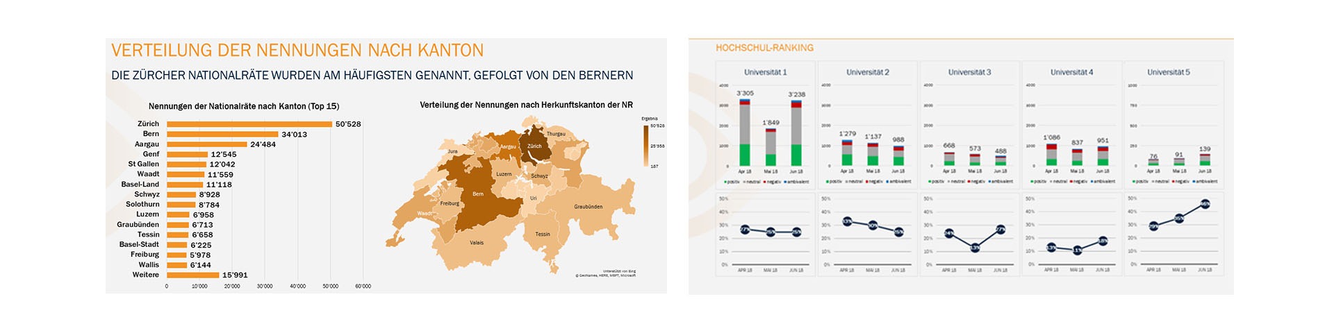Nos clients nous demandent de plus en plus souvent comment évaluer leur présence médiatique. La comparaison avec les concurrents directs constitue la meilleure réponse à cette question. Elle permet de déterminer le potentiel de présence médiatique, d’identifier et de déduire des effets et changements spécifiques à un secteur dans le paysage médiatique. La comparaison offre donc le meilleur cadre de référence pour toute interprétation de la présence médiatique. À côté du dénombrement des articles, les thèmes définis et l’impact des communiqués dans les médias peuvent aussi être analysés ; la tonalité et les représentants peuvent être déterminés.